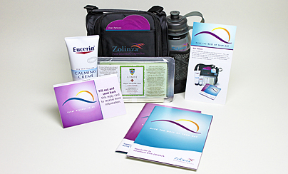 Upon initiation, the patient starter kit provides needed items that include a water bottle, a cooling skin patch, and brochures.